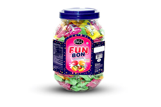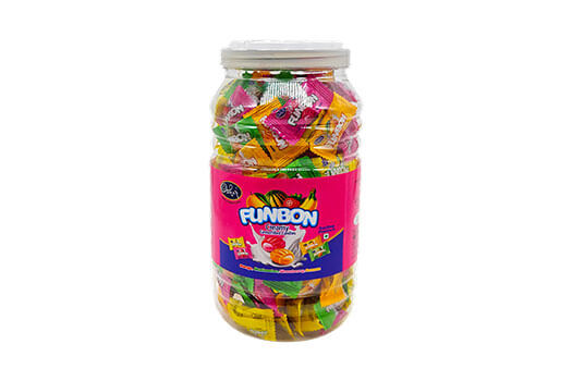 Funbon Milk AssortedFunbon milk assorted candies. Creamy center filled candies DESCRIPTION QTY PER CASE NET WEIGHT Pouch 16 Packets X 608 g 9.72 Kgs Jar 16 Jars X 160 g 12.16 Kgs Categories: Formed Candies, Formed Candies, Homecat